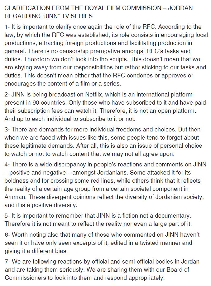 Was Dschinn betreffe, gebe es in der jordanischen Bevölkerung eine große Bandbreite an Meinungen, so die RFC. Während die einen die Serie wegen ihrer „kühnen“ Szenen und des „Überschreitens roter Linien“ angriffen, „denken andere, dass es die Wirklichkeit einer bestimmten Altersgruppe in einer bestimmten Gesellschaftsschicht in Amman wiedergibt. Diese divergierenden Meinungen spiegeln die Diversität der jordanischen Gesellschaft wider, und das ist eine positive Diversität.“ Es sei „wichtig, anzumerken, dass Dschinn eine fiktionale Geschichte ist und kein Dokumentarfilm“. Darum beabsichtige die Serie nicht, die „Realität widerzuspiegeln oder auch nur große Teile davon“. Es sei auch erwähnenswert, dass viele jener, die Kommentare zu Dschinn abgäben, die Serie gar nicht gesehen hätten oder höchstens Ausschnitte daraus, „die auf verdrehte Art zusammengeschnitten wurden“ und so einen anderen Eindruck erzeugten. Zum Schluss merkt die RFC an, dass sie die Reaktionen der staatlichen und halbstaatlichen Gremien in Jordanien verfolge, ernst nehme und „angemessen reagieren“ werde.