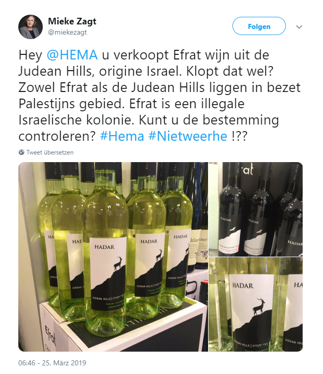 „Hey @HEMA, ihr verkauft Efrat-Wein aus den Judäischen Hügeln, der in Israel hergestellt wurde. Kann das sein? Efrat und die Judäischen Hügel liegen im besetzten palästinensischen Gebiet. Efrat ist eine illegale israelische Kolonie. Könnt ihr die Herkunft kontrollieren?“
